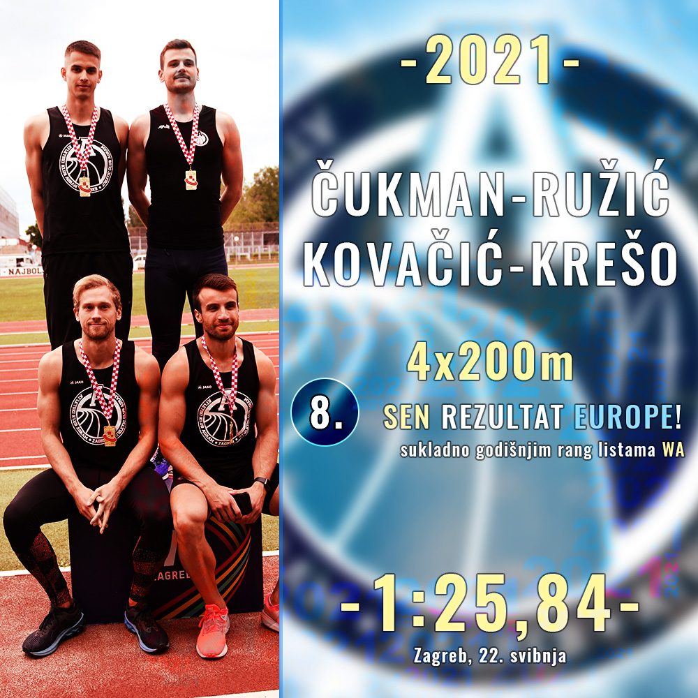 I za kraj pregleda nam ostaje sjajna 4x200m štafeta s Hrvojem Čukmanom, Mateom Ružićem, Mateom Kovačićem i Dominikom Krešom koja je s novim hrvatskim rekordom 1:25,84 uspjela ući ispod zadanog limita tablica Svjetske atletike (ne pokazuje sporije rezultate od 1:26,00) i tako se etablirala kao 8. najbolja štafeta u Europi kada je ova disciplina u pitanju.