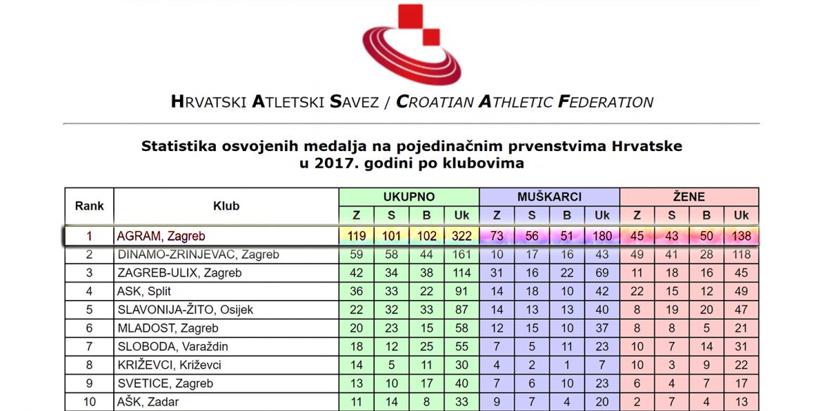 Sveukupno smo osvojili nestvarnih 322 medalje od čega je njih čak 119 zlatnih, 101 srebrna i 102 brončane! Usporedno s prošlom godinom imamo 14 prvaka više, 14 srebra manje i 13 brončanih atletičara više. Posebno impresivno zvuči podatak da smo osvojili točno dvostruko više sveukupnih medalja od drugoplasiranog kluba dok isto tako brojimo više nego dvostruko prvaka Hrvatske naspram njih, a dodatno naspram i ostalih pozicioniranih.